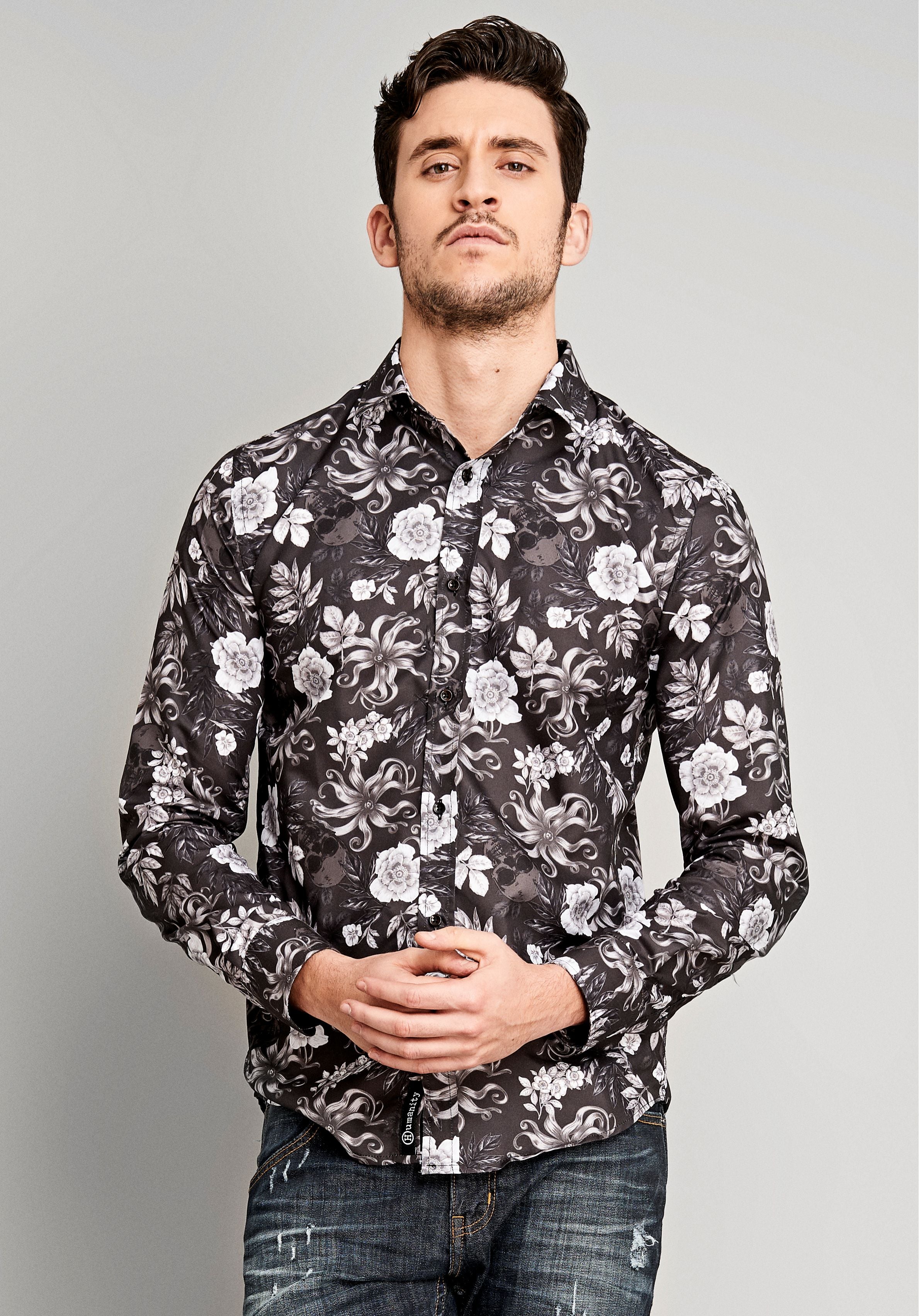 Tejido 100% algodón. Slim fit. Diseño estampado floral en tonos negros, grises y blanco. Cuello camisero. Cierre de botones. Manga larga.
