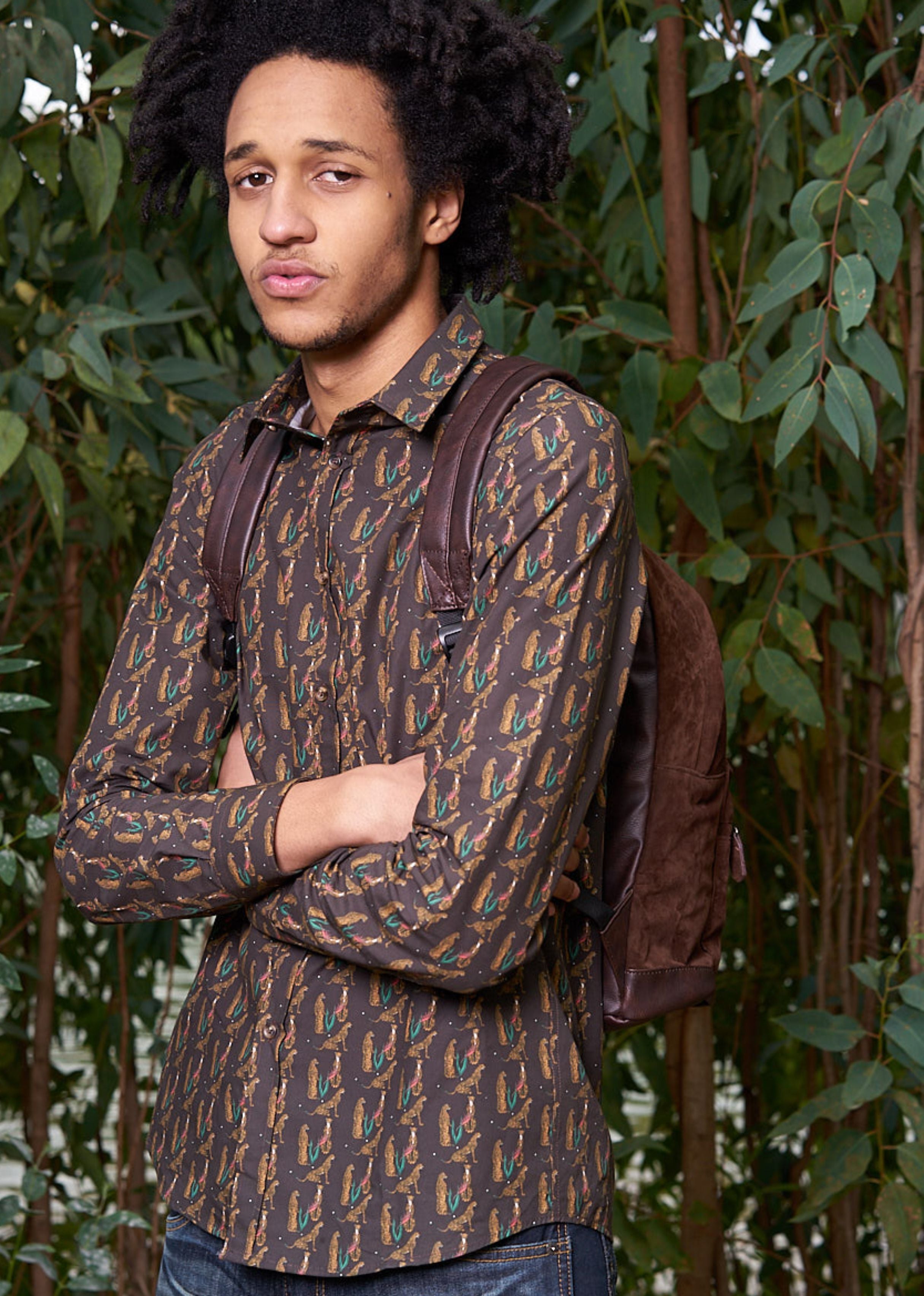 Tejido 100% algodón. Slim fit. Diseño estampado animal print. Cuello camisero. Cierre de botones. Manga larga.