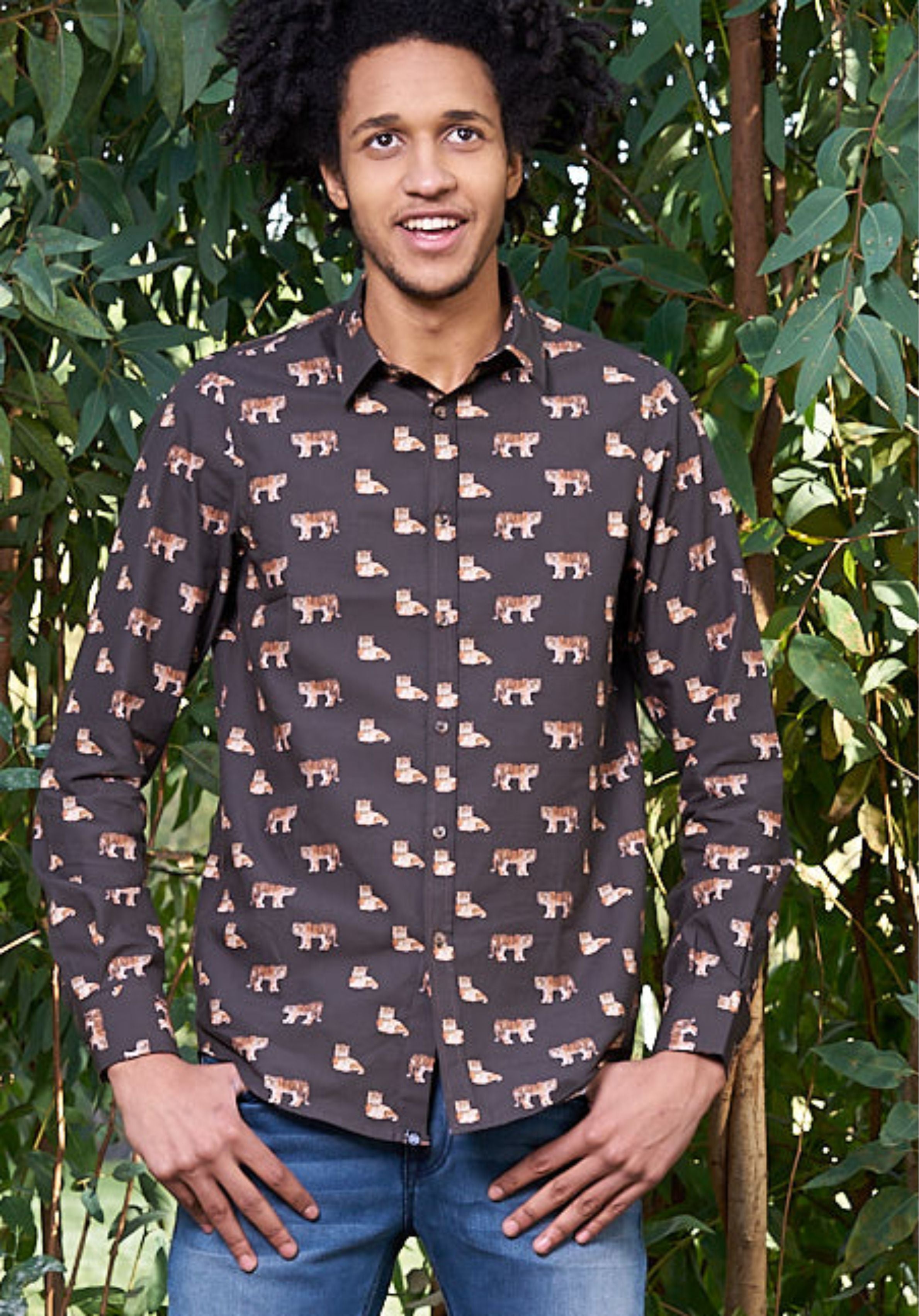 Tejido 100% algodón. Slim fit. Diseño estampado tigres. Cuello camisero. Cierre de botones. Manga larga.
