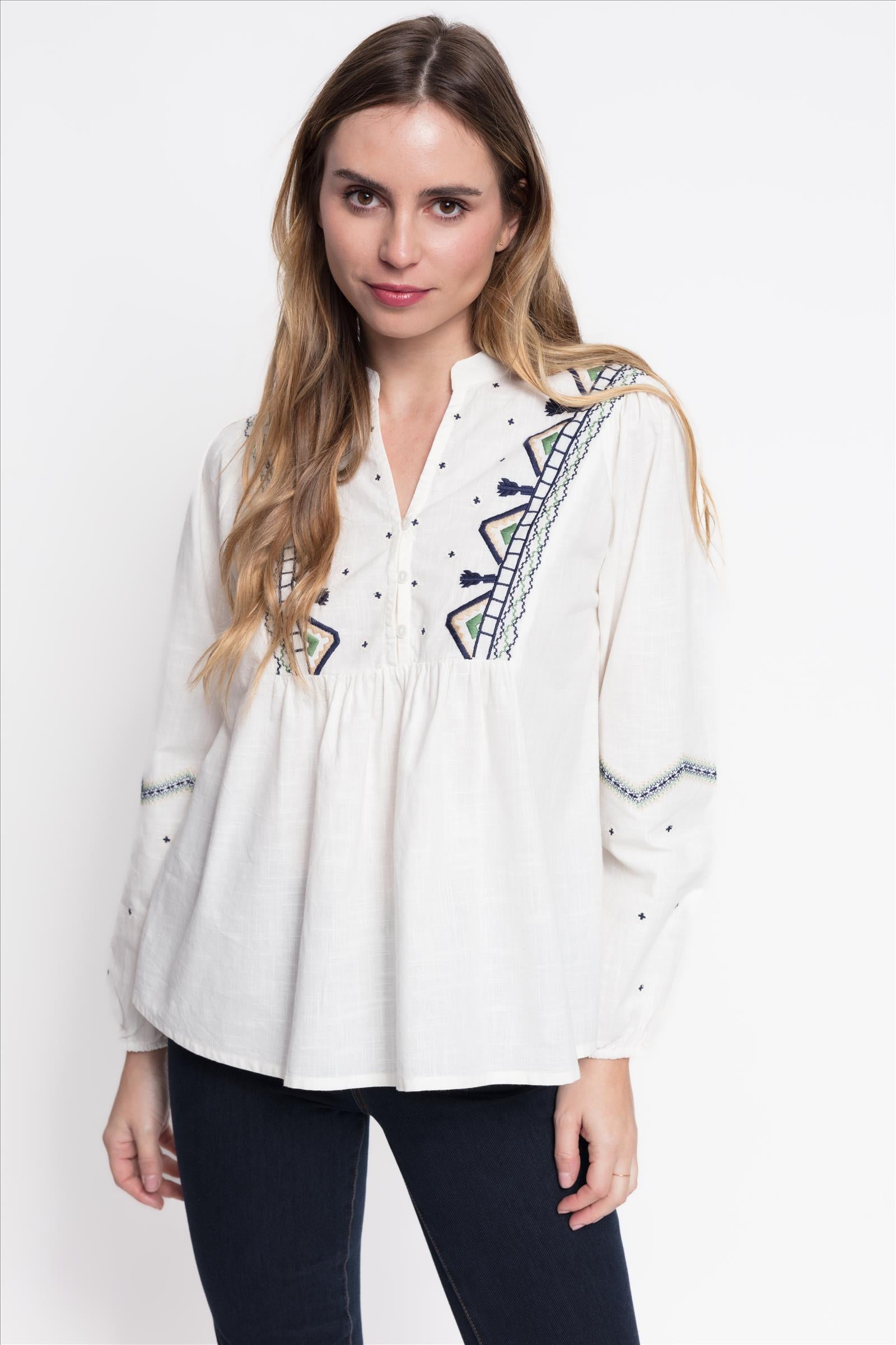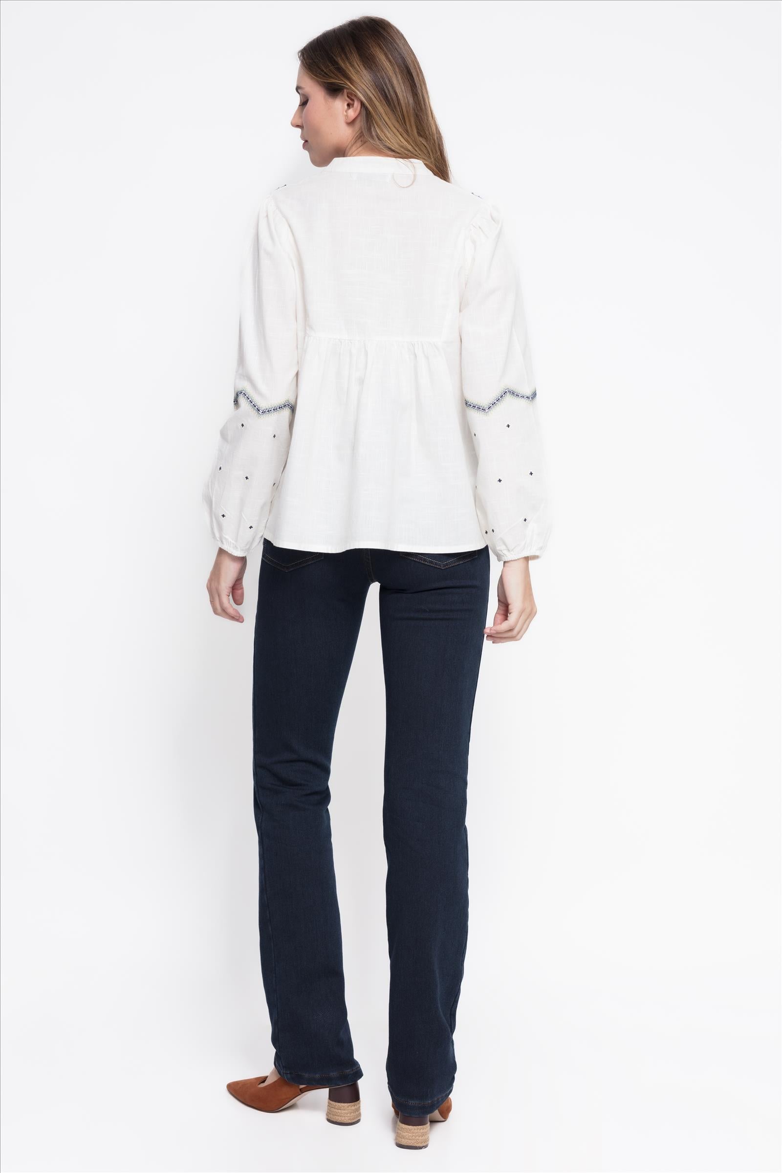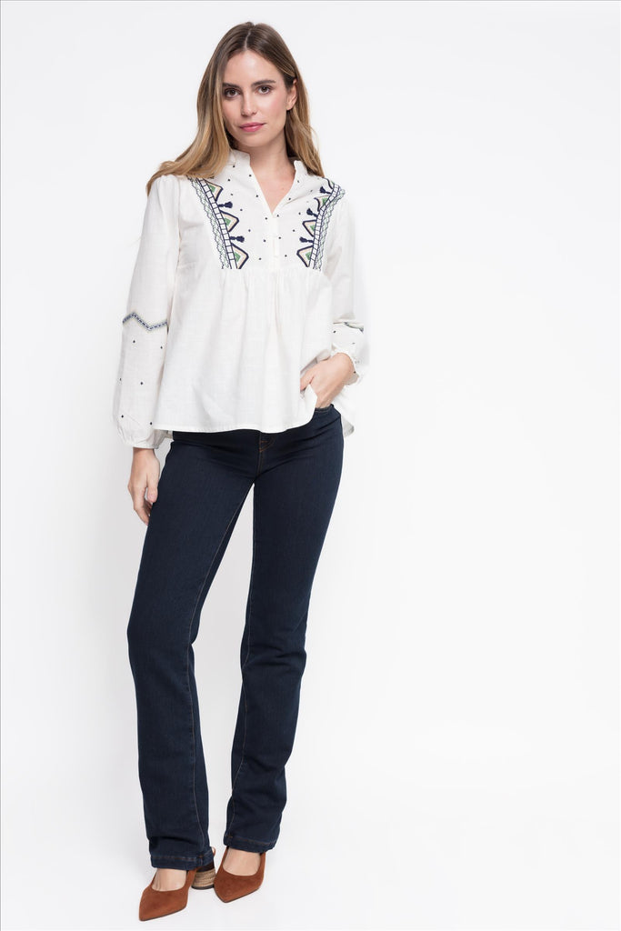 Blusa blanca de algodón con bordado a contraste. Manga amplia con goma en puños y escote en V.
