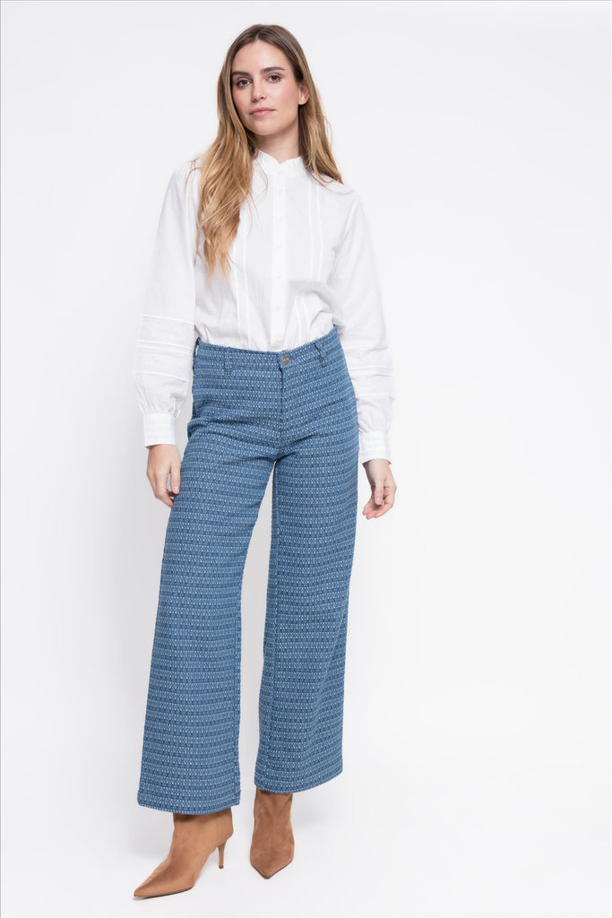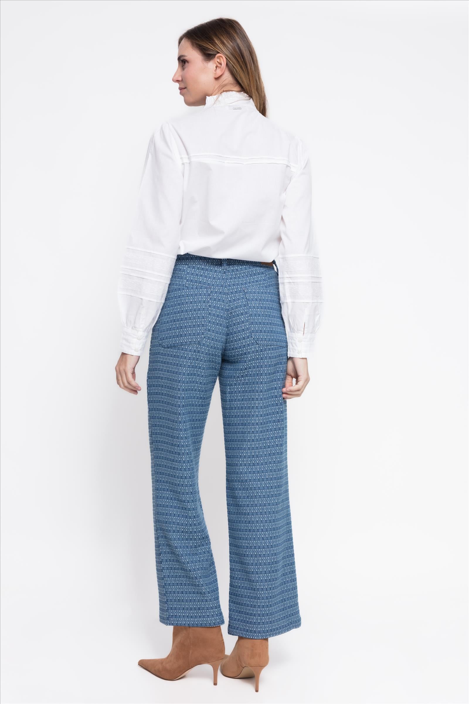 Blusa en color blanco natural 100% algodón. Abotonada y detalle de jaretas y tiras bordadas en cuerpo y mangas. Cuello de tirilla con volantito.