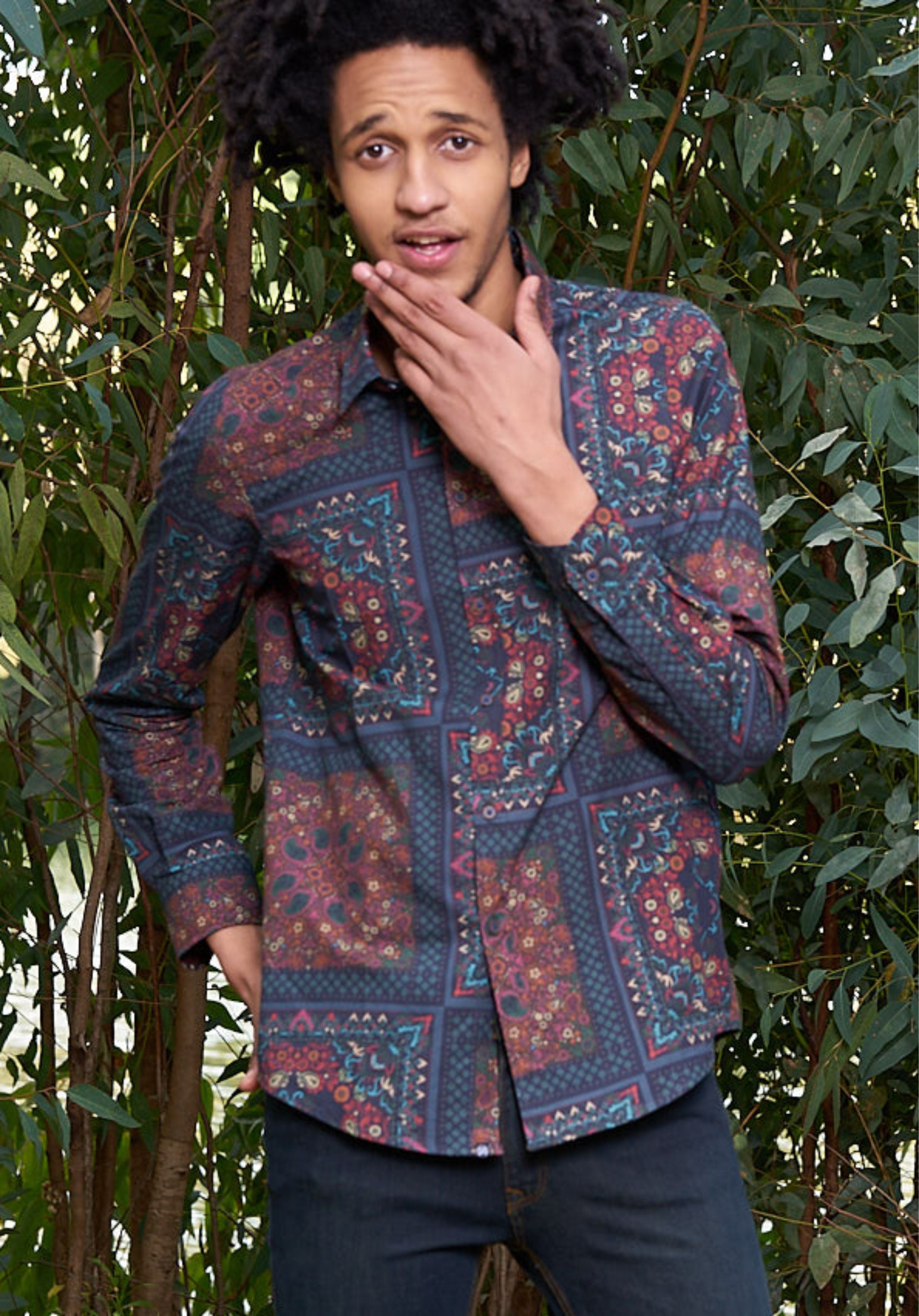 Tejido 100% algodón. Slim fit. Diseño estampado patchwork en tonos azules y granates. Cuello camisero. Cierre de botones. Manga larga.